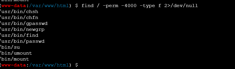 1 | find / -perm -4000 -type f 2>/dev/null |